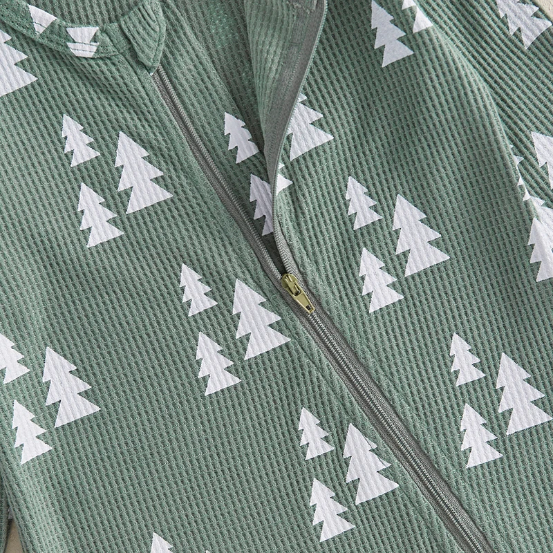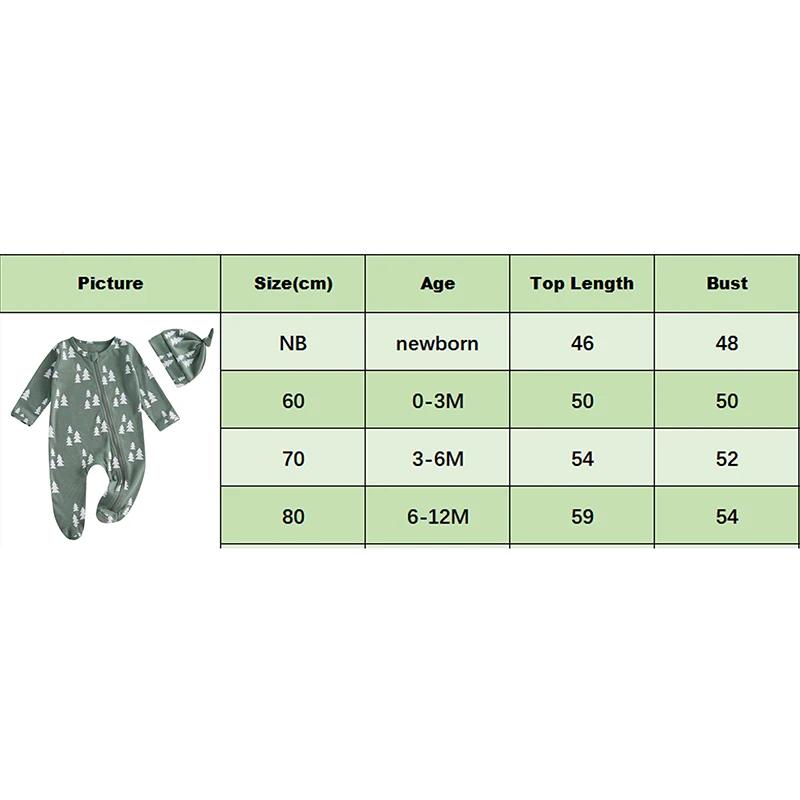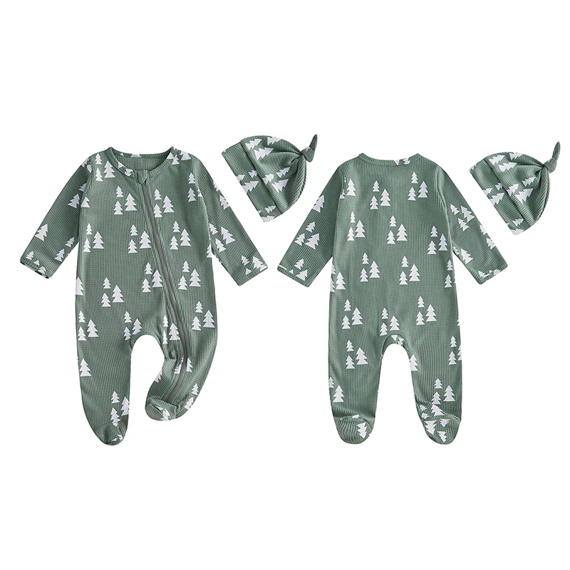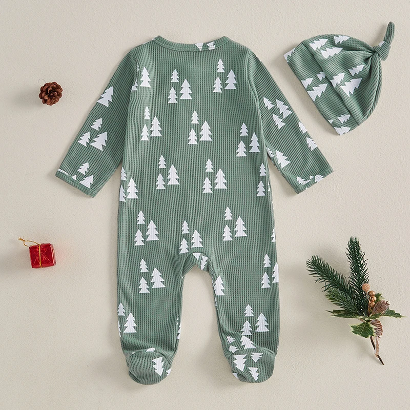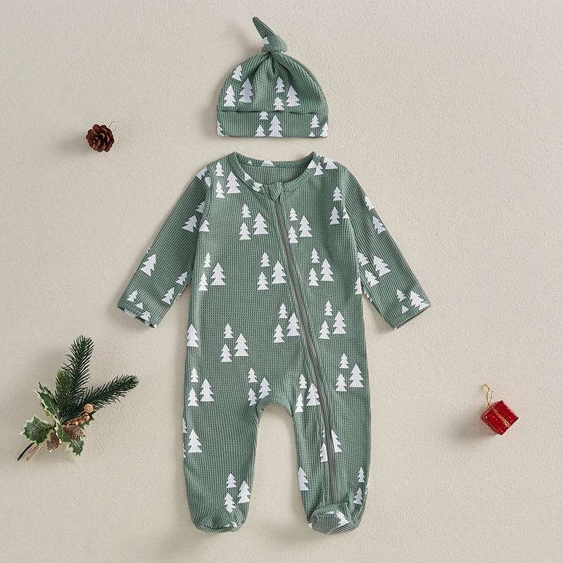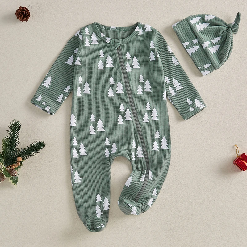 π What is it - The FOCUSNORM Newborn Christmas Romper Set features an adorable Xmas tree print with a long sleeve zip-up design, perfect for your little one. This 2-piece set includes a cozy footed jumpsuit and a charming knot hat, designed for comfort and festive cheer!